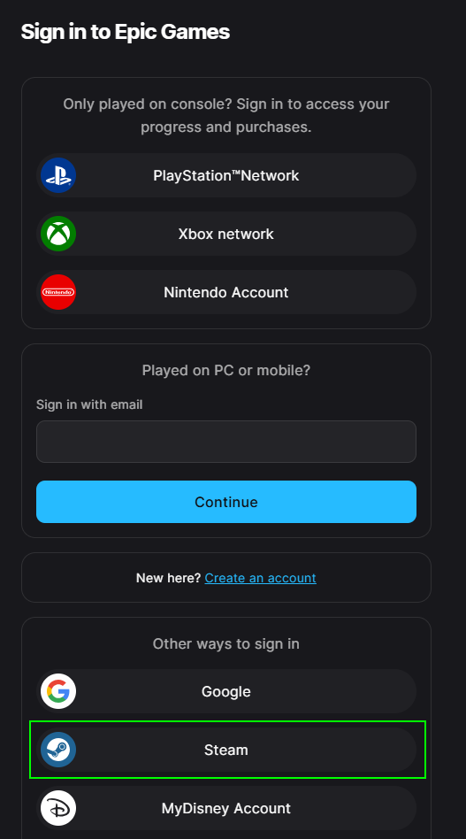 6. Si vous souhaitez jouer sur PC/Mobile, vous pouvez maintenant commencer à jouer à partir du lanceur Epic. Assurez-vous tout simplement de vous connecter au lanceur Epic Games avec le même compte Epic Games que celui auquel vous venez de vous connecter. Si vous souhaitez également partager votre progression et vos achats Steam avec d'autres plateformes, passez à l'étape suivante. Si vous ne le souhaitez pas, vos étapes s'arrêtent ici.