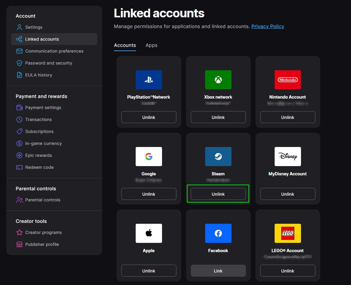 4. Allez sur la page Comptes associés (S'ouvre dans un nouvel onglet) et cliquez sur Dissocier sous la plateforme pour laquelle vous avez reçu l'erreur.