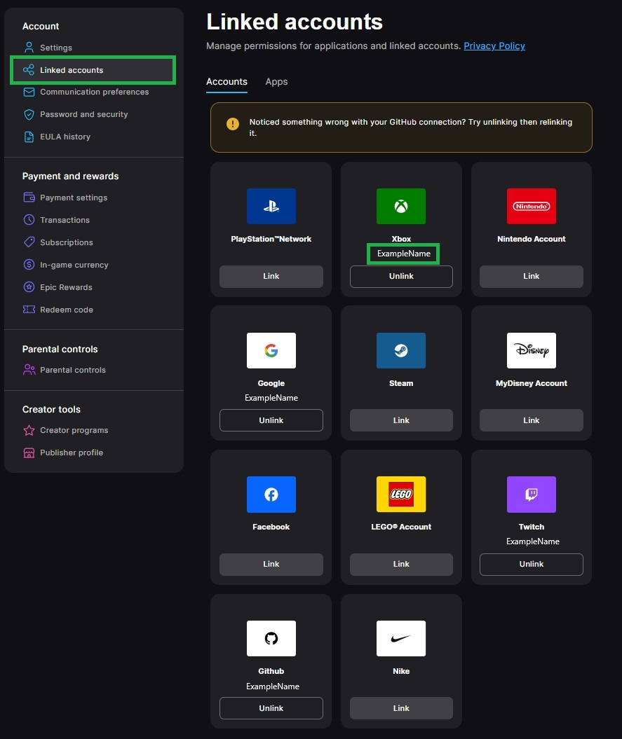 Not: PC'de, Nintendo'da ve mobil cihazlarda oyun her zaman Epic Games hesabının görünen adını gösterir.