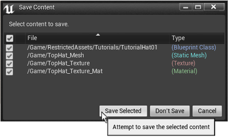 TopHat_Mesh.FBX and TopHat_Texture.TGA located in ...\UnrealTournament\Content\RestrictedAssets\Tutorials\...You should see a top hat Static Mesh and a top hat Texture in your Content Browser.