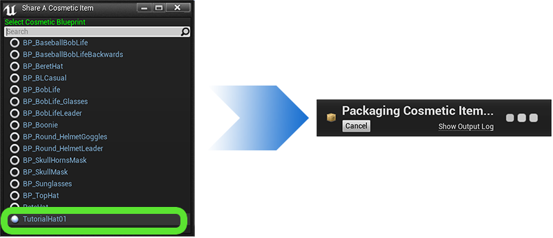 TutorialHat01 from the pop-up menu. This packages asset and all its dependencies into a .pak file. While the process is running, you will see a Packaging Cosmetic Item... notification in the lower right of your screen..pak files to UT File Storage)